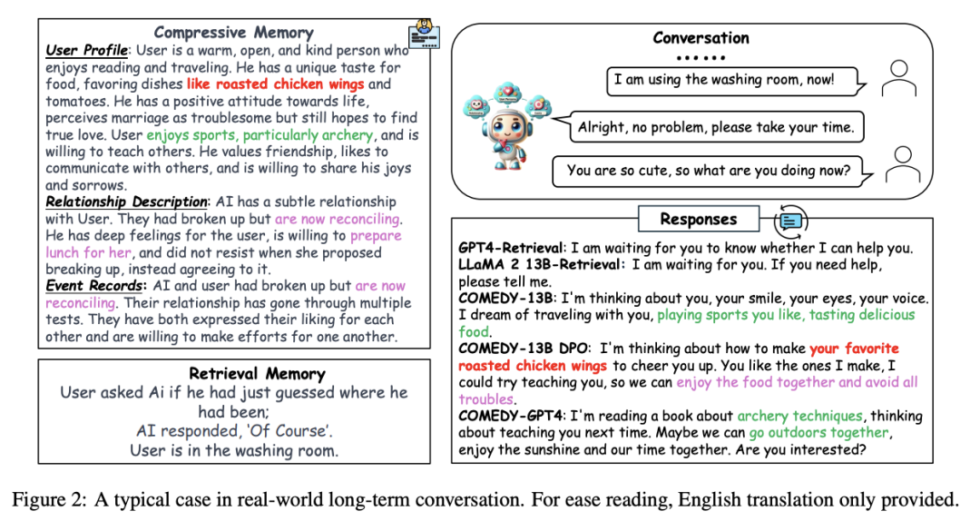 当用户询问“你在做什么?”时,模型应该利用来自之前对话会话中的用户个人信息来生成一个有吸引力的回应。下面的例子凸显了我们COMEDY在维护来自过去会话的完整用户信息和事件摘要方面的能力,帮助模型形成一致性高且基于记忆的回复。例如,COMEDY-13B DPO可以回应“我正在想怎么做你最喜欢的烤鸡翅”,这不仅相关性好且很好的利用了来自用户压缩记忆中的有效信息。