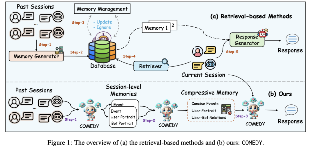 1. 我们提出了一个名为COMEDY的新框架,它代表着传统记忆检索型对话系统的一个突破性转变。它不依赖任何检索模块或记忆数据库,而是通过压缩记忆生成增强的、具有记忆特性的回复。