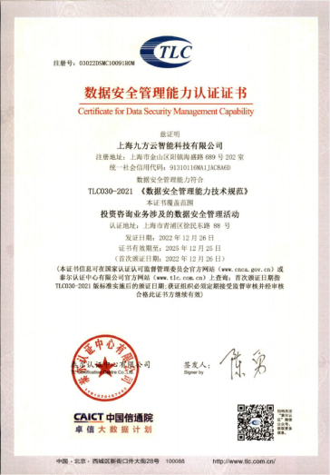 九方智投获中国信通院“数据安全管理能力认证”证书