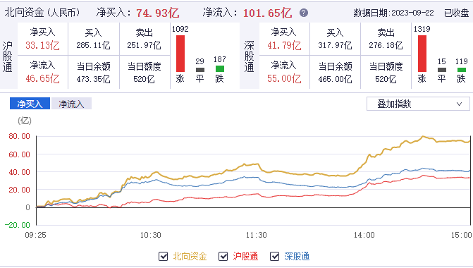 盘面上,CPO、鸿蒙概念、手机游戏、算力等板块涨幅居前,芬太尼、煤炭、贵金属、ST板块等板块跌幅居前。同时,沪深两市总成交额7654亿,较上个交易日放量1864亿。而北上资金,则在今日净买入74.93亿,开始大幅买入。