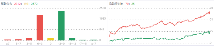 整体来看,市场今天日内走V,到收盘看指数震荡分化,个股涨跌互半,结构性行情特别明显。情绪面来看,今日涨停70家跌停25家,依旧是两极分化。