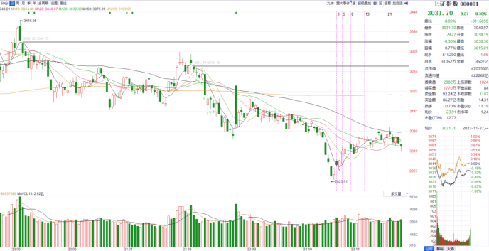 小节奏上,小时线级别走势来看,目前沪指已经击穿3030一带平台,短期,需要我们注意防范指数缩量突破3062点,形成扩张型结构走势之后,再迎来破新低走势,也即是今日低点未来大概率还将继续击穿,然后考验2980点附近支撑。