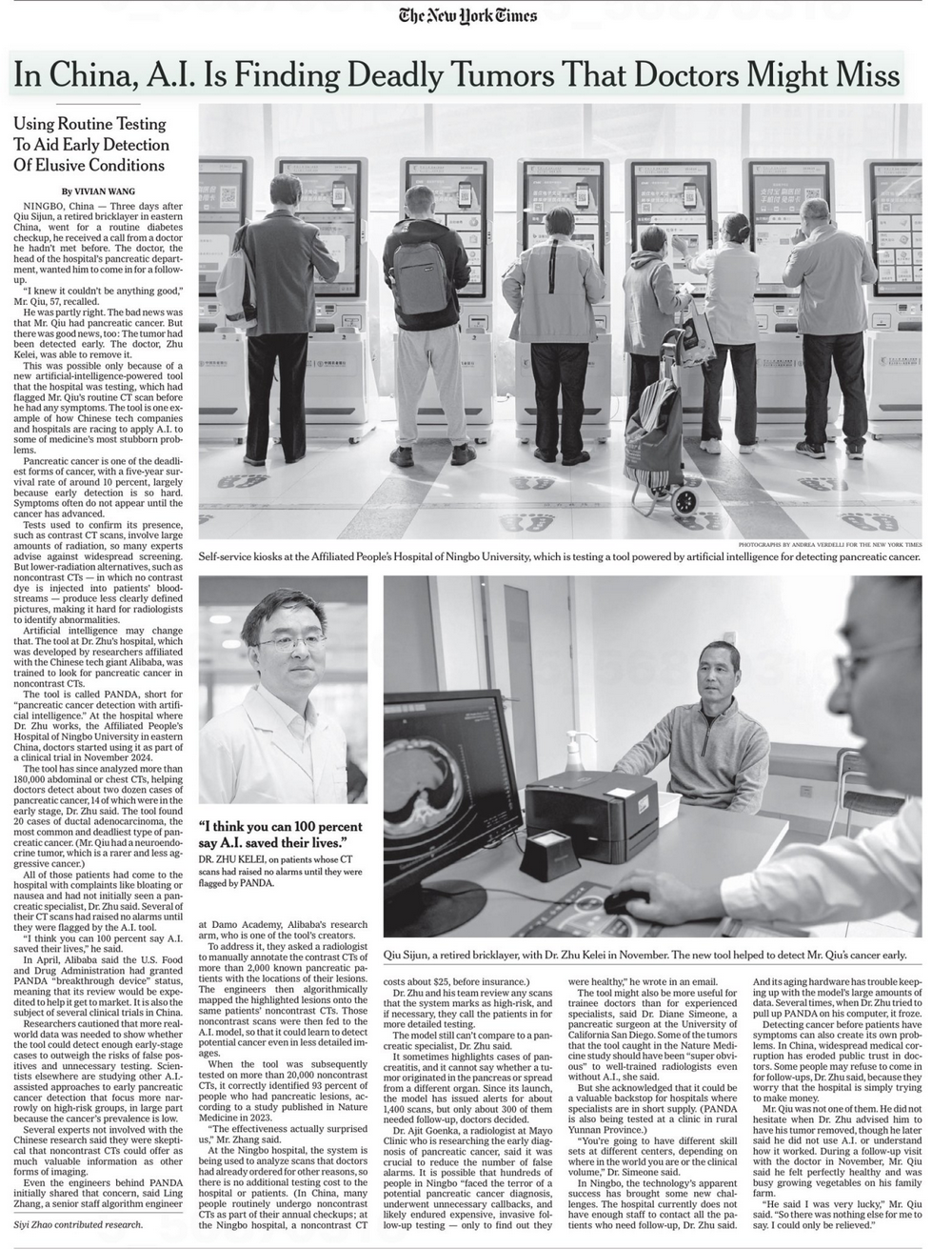 《科创板日报》1月7日讯(编辑 宋子乔) 据中国网援引美国《纽约时报》,当地时间1月2日,后者整版报道介绍了阿里巴巴研发的胰腺癌早筛AI模型——57岁的邱先生因腹胀、恶心等症状去医院,在宁波大学附属第一医院进行常规糖尿病检查时接到电话通知:阿里巴巴达摩院开发的AI模型从他的平扫CT片里发现了早期胰腺癌。