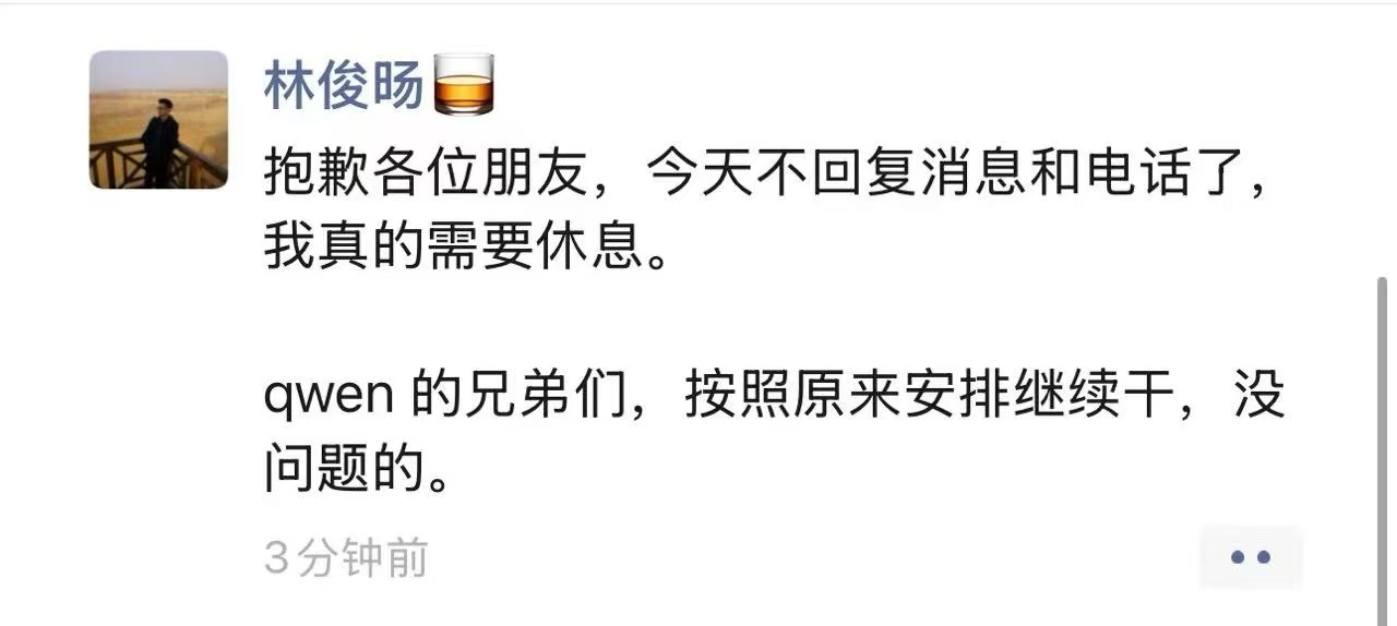 3月3日晚11点,林俊旸在朋友圈分享音乐《敬自己一杯》。3月4日下午,《科创板日报》记者注意到,他再度更新朋友圈表示:“抱歉各位朋友,今天不回复消息和电话了,我真的需要休息。Qwen的兄弟们,按照原来安排继续干,没问题的。”