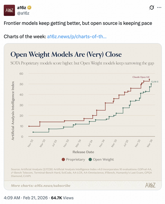 硅谷顶级风投机构a16z近期发布的行业报告指出,开源大模型与顶级闭源模型之间的能力差距,正在以肉眼可见的速度快速收窄,而报告中被拿来与闭源天花板Claude Opus 4.6正面对标的,正是来自智谱的开源模型GLM-5。