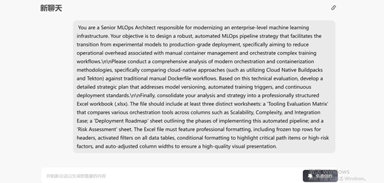 紧接着,记者还聚焦企业级MLOps架构规划与Excel交付的核心需求,验证其在专业技术场景下的落地能力。