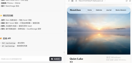 仅数分钟,GLM-5便完整生成了适配建筑、自然与人像摄影的专业作品集网站,同步输出了符合要求的全页面设计与可部署前后端代码。
