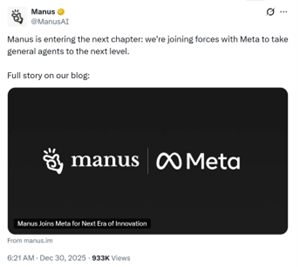 12月30日,硅谷科技巨头Meta正式宣布,已收购人工智能体公司蝴蝶效应(Butterfly Effect),该公司旗下拥有广受关注的AI智能体产品Manus。收购完成后,蝴蝶效应将保持独立运作,创始人肖弘出任Meta副总裁。