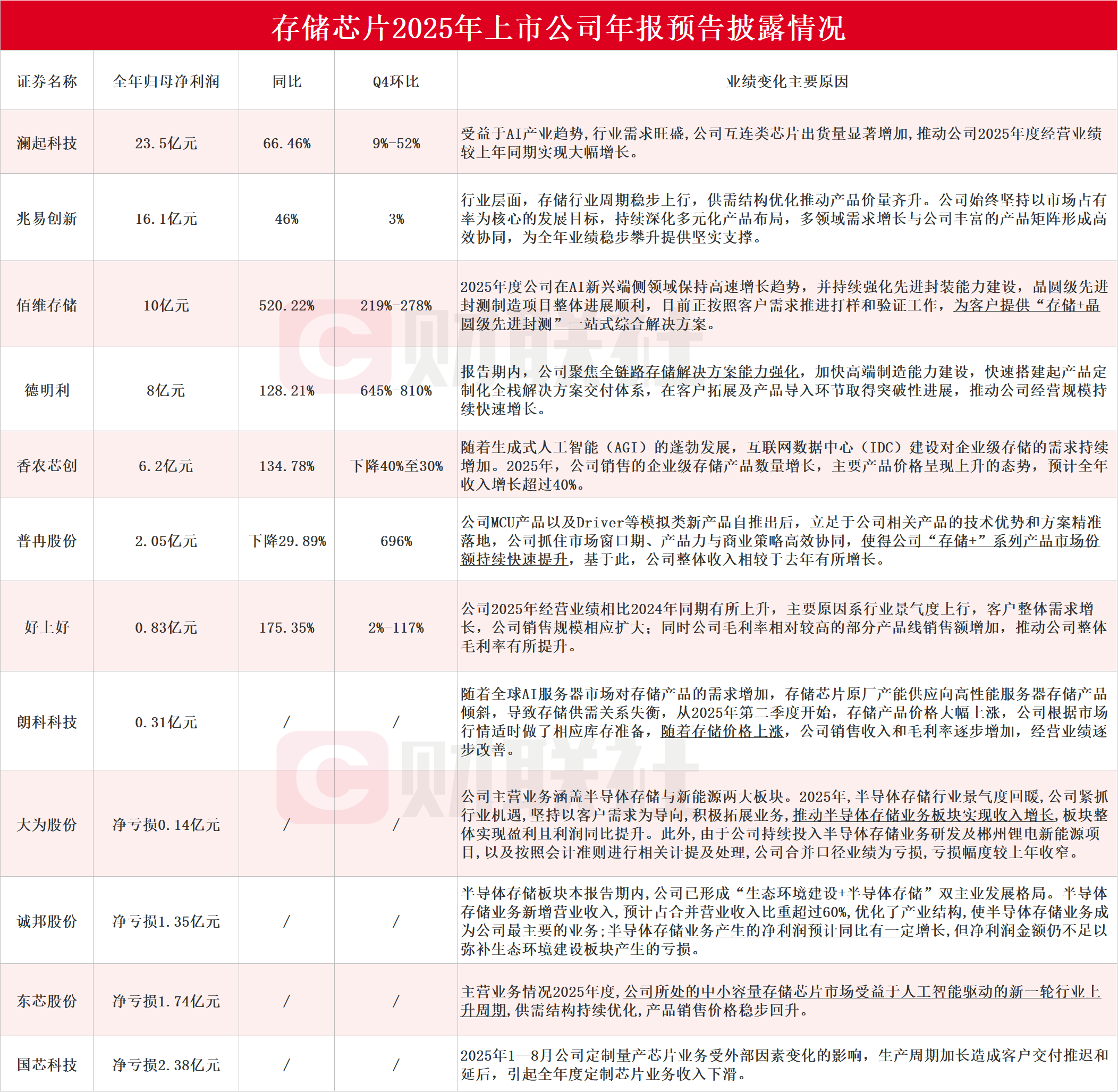 【多家存储芯片上市公司披露2025年度业绩预告 德明利Q4净利预计环比增长645%-810%】财联社1月28日电,据财联社不完全统计,截至发稿,包括澜起科技、兆易创新、佰维存储、德明利、香农芯创、普冉股份、好上好、朗科科技、大为股份、诚邦股份、东芯股份和国芯科技在内的多家存储芯片上市公司披露2025年度业绩预告。其中,澜起科技2025年净利同比预增52%-66%,德明利Q4净利预计环比增长645%-810%。