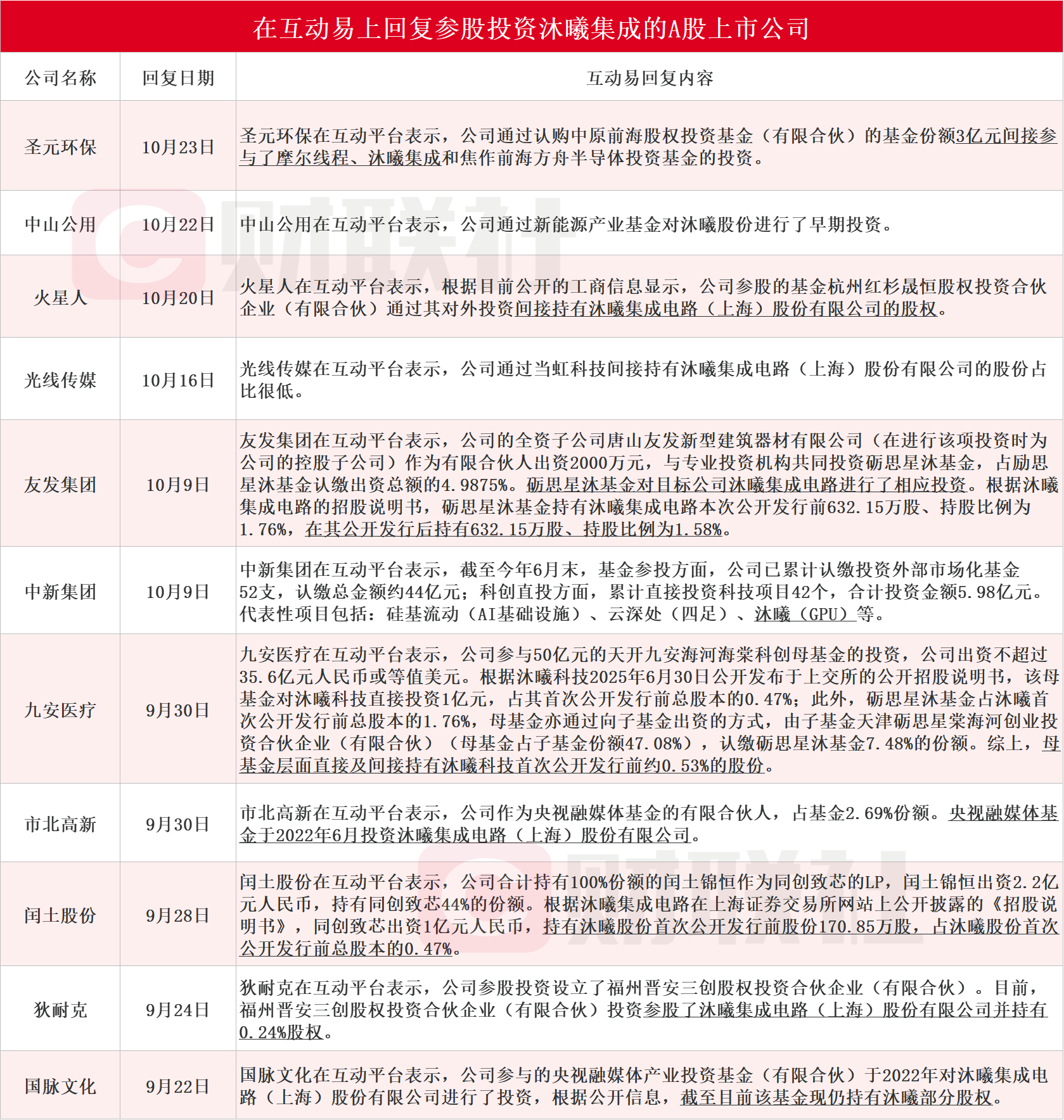 【沐曦集成科创板IPO上会在即 十余家上市公司互动易回复参股投资】财联社10月23日电,沐曦集成科创板IPO将于10月24日上会。据财联社不完全统计,圣元环保、中山公用、火星人、光线传媒、友发集团、中新集团、九安医疗、市北高新、闰土股份、狄耐克、国脉文化在内的11家A股上市公司在互动易上回复参股投资沐曦集成。其中,圣元环保今日在互动平台表示,公司通过认购中原前海股权投资基金(有限合伙)的基金份额3亿元间接参与了摩尔线程、沐曦集成和焦作前海方舟半导体投资基金的投资。