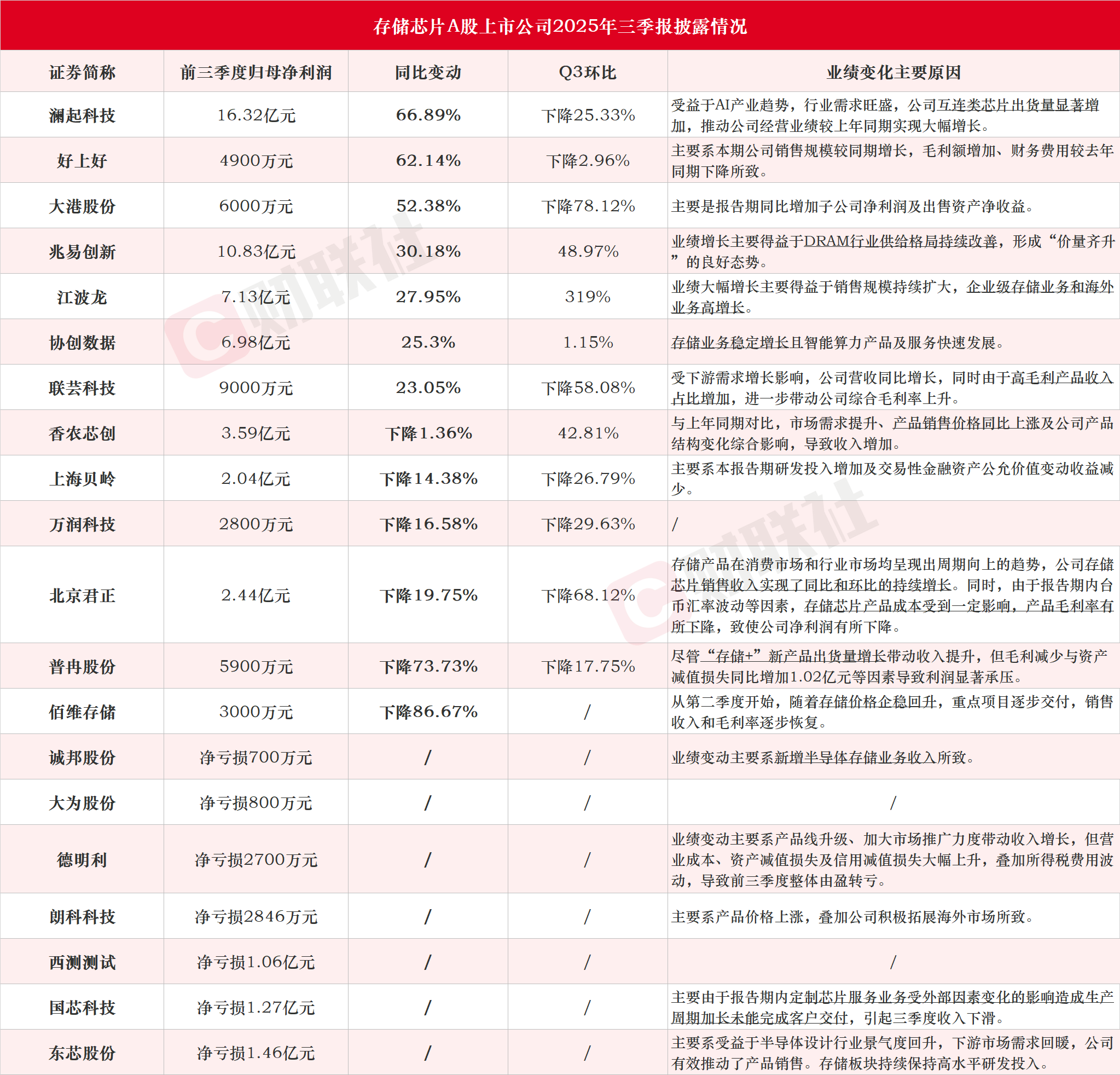 【多家存储芯片上市公司披露三季报 江波龙Q3净利润环比增长319%】据财联社不完全统计,截至发稿,包括澜起科技、好上好、大港股份、兆易创新、江波龙、协创数据、联芸科技、香农芯创、上海贝岭、万润科技、北京君正、普冉股份、佰维存储、诚邦股份、大为股份、德明利、朗科科技、西测测试、国芯科技、东芯股份在内的多家存储芯片上市公司披露三季报。其中,澜起科技前三季度净利润同比增长67%,江波龙Q3净利环比增长319%。