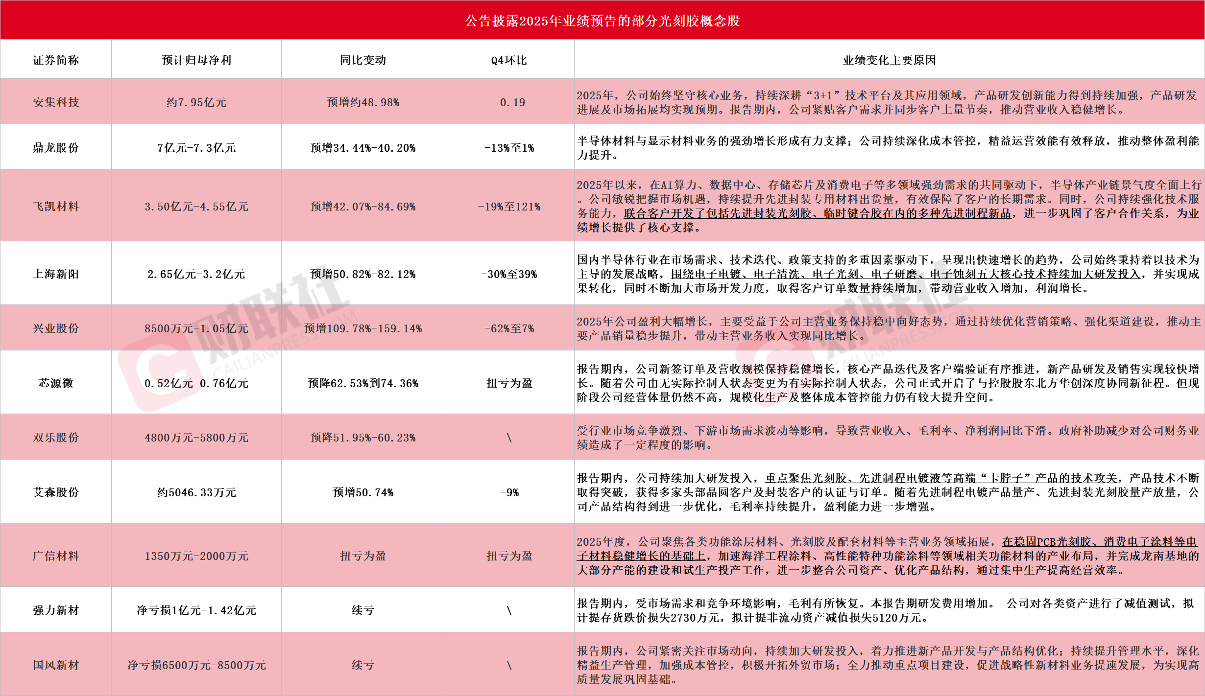 十余只光刻胶概念股披露2025年业绩预告 飞凯材料Q4环比最高预增121%