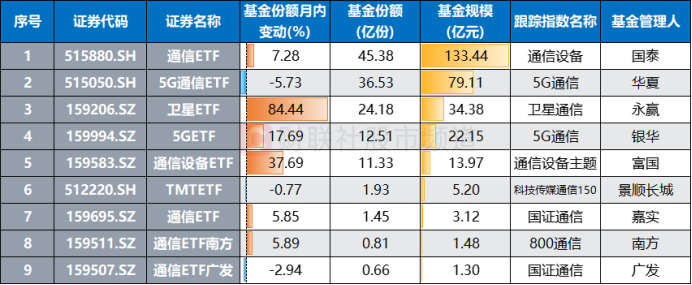 从基金份额上看,截至12月19日数据。通信相关ETF本月的基金份额整体呈现增多减少的状态。其中,基金规模最大的通信ETF(515880)月内份额增长近7.28%,规模位居第二的5G通信ETF(515050)份额则减少近5.73%。此外,卫星ETF(159206)、通信设备ETF(159583)月内份额有明显增长,增幅分别达84.44%、37.69%。