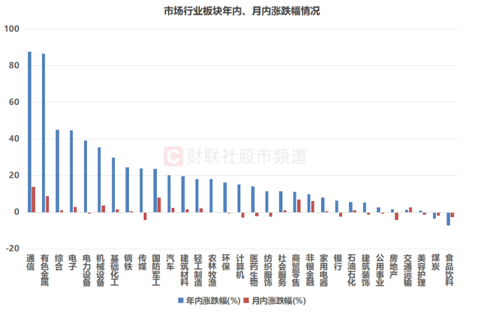 受CPO等概念活跃提振,通信板块在近期的年末行情中涨势最为凌厉。截至今日收盘,其板块指数(申万一级)年内涨幅扩大至87.77%,超越原先领跑市场的有色金属板块,成为目前年涨幅最高的行业。其中,通信板块本月涨幅达13.89%,在31个申万一级板块中也位居首位,并大幅高于位列第二位、第三位的有色金属(8.92%)、国防军工(7.92%)。