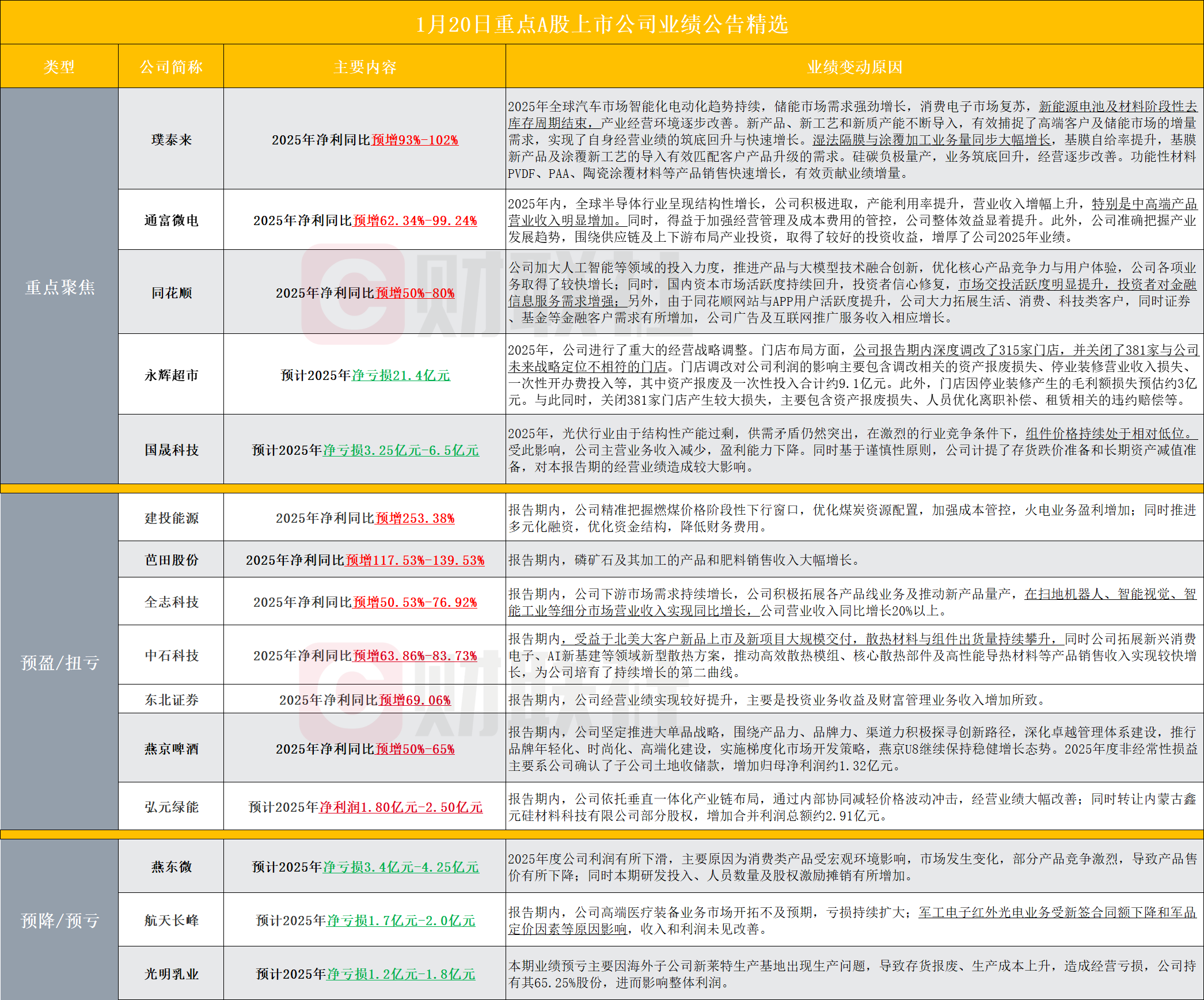 【盘后A股上市公司重点业绩公告精选】财联社1月20日电,据财联社不完全统计,截至发稿,盘后包括璞泰来、通富微电、同花顺、永辉超市、国晟科技、建投能源、芭田股份、全志科技、中石科技、东北证券、燕京啤酒、弘元绿能、燕东微、航天长峰、光明乳业等多家A股上市公司发布2025年业绩预告。其中,同花顺公告,预计2025年归母净利润为27.35亿元–32.82亿元,同比增长50%-80%。国晟科技公告,预计2025年净亏损3.25亿元-6.5亿元,组件价格持续处于相对低位导致主营业务收入减少。