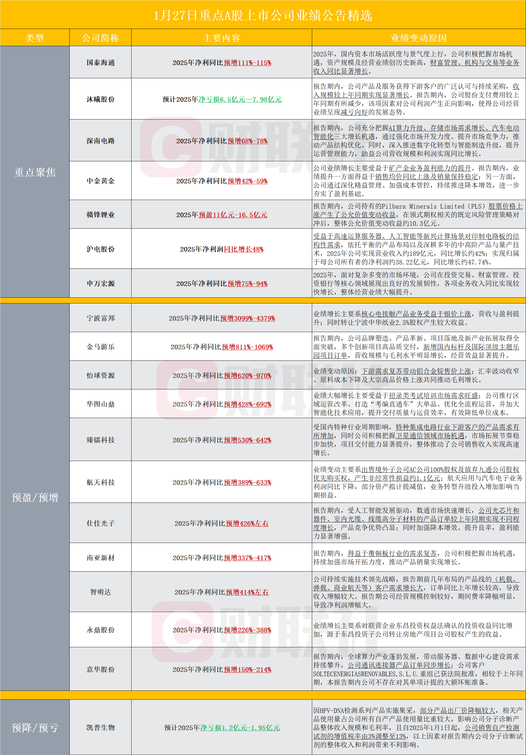 【盘后A股上市公司重点业绩公告精选】财联社1月27日电,据财联社不完全统计,截至发稿,盘后包括国泰海通、沐曦股份、深南电路、中金黄金、赣锋锂业、沪电股份、申万宏源、宁波富邦、金马游乐、怡球资源、华图山鼎、臻镭科技、航天科技、仕佳光子、南亚新材、智明达、永鼎股份、意华股份、凯普生物等多家A股上市公司发布2025年业绩预告或业绩快报。其中,沐曦股份公告,2025年预计净亏损6.5亿元-7.98亿元,同比减亏。臻镭科技公告,2025年净利同比预增530%-642%,卫星通信领域项目交付能力显著提升。