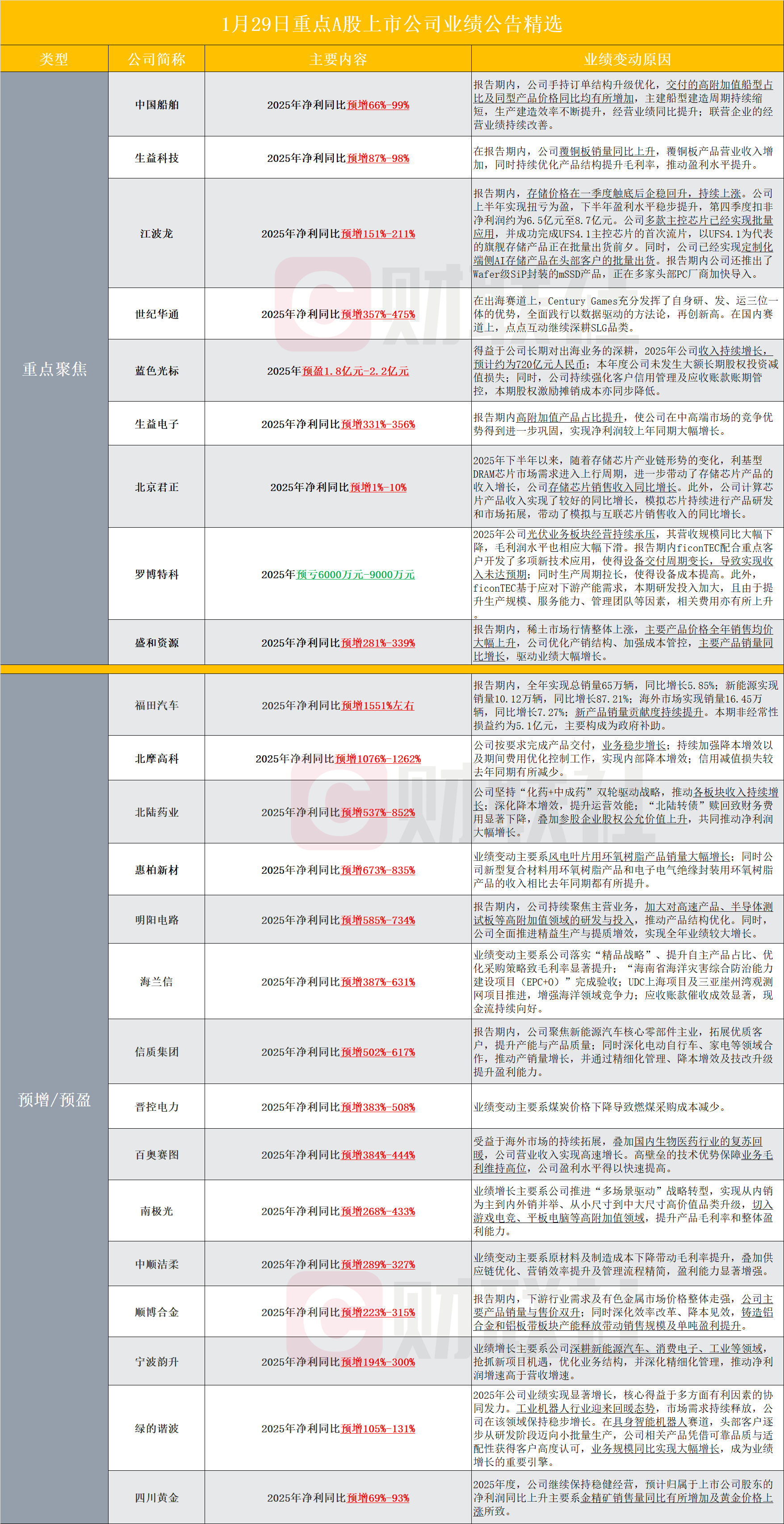 【盘后A股上市公司重点业绩公告精选】财联社1月29日电,据财联社不完全统计,截至发稿,盘后包括中国船舶、生益科技、江波龙、世纪华通、蓝色光标、生益电子、北京君正、罗博特科、盛和资源、福田汽车、北摩高科、北陆药业、惠柏新材、明阳电路、海兰信、信质集团、晋控电力、百奥赛图、南极光、中顺洁柔、顺博合金、宁波韵升、绿的谐波、四川黄金等多家A股上市公司发布2025年业绩预告。其中,江波龙公告,2025年净利同比预增151%-211%。