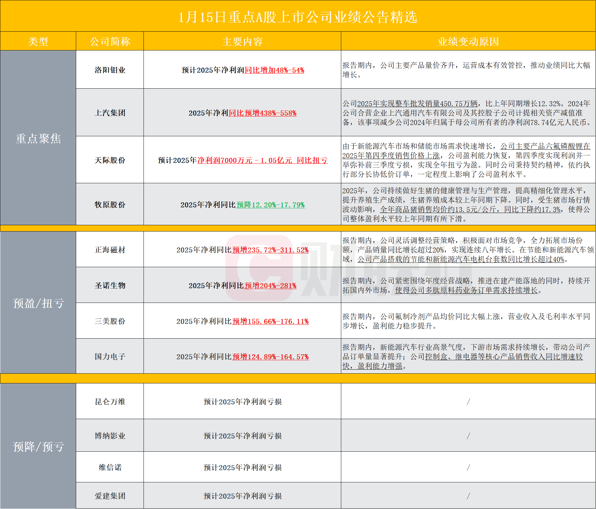 【盘后A股上市公司重点业绩公告精选】财联社1月15日电,据财联社不完全统计,截至发稿,盘后包括洛阳钼业、上汽集团、天际股份、牧原股份、正海磁材、圣诺生物、三美股份、国力电子、昆仑万维、博纳影业、维信诺和爱建集团等多家A股上市公司发布2025年业绩预告。其中,洛阳钼业预计2025年净利润同比增加48%-54%;上汽集团2025年净利同比预增438%-558%。