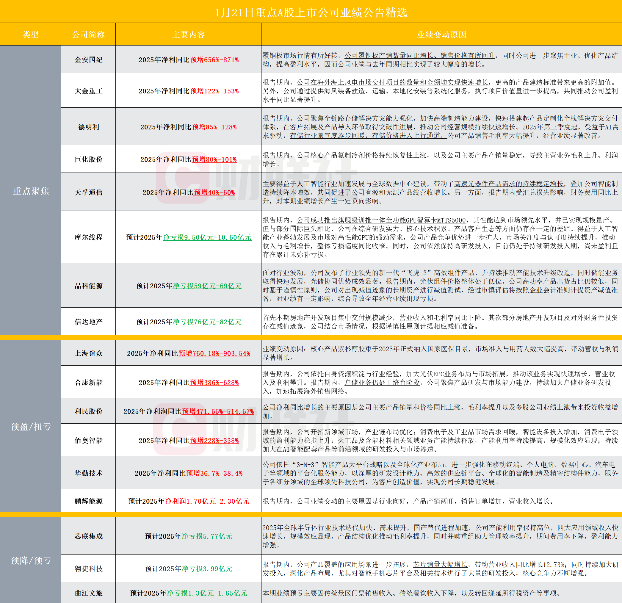 【盘后A股上市公司重点业绩公告精选】财联社1月21日电,据财联社不完全统计,截至发稿,盘后包括金安国纪、大金重工、德明利、巨化股份、天孚通信、摩尔线程、晶科能源、信达地产、上海谊众、合康新能、利民股份、佰奥智能、华勤技术、鹏辉能源、芯联集成、翱捷科技、曲江文旅等多家A股上市公司发布2025年业绩预告。其中,天孚通信公告,2025年净利同比预增40%-60%,有源和无源产品线营收增长。摩尔线程公告,预计2025年净亏损9.5亿元-10.6亿元。