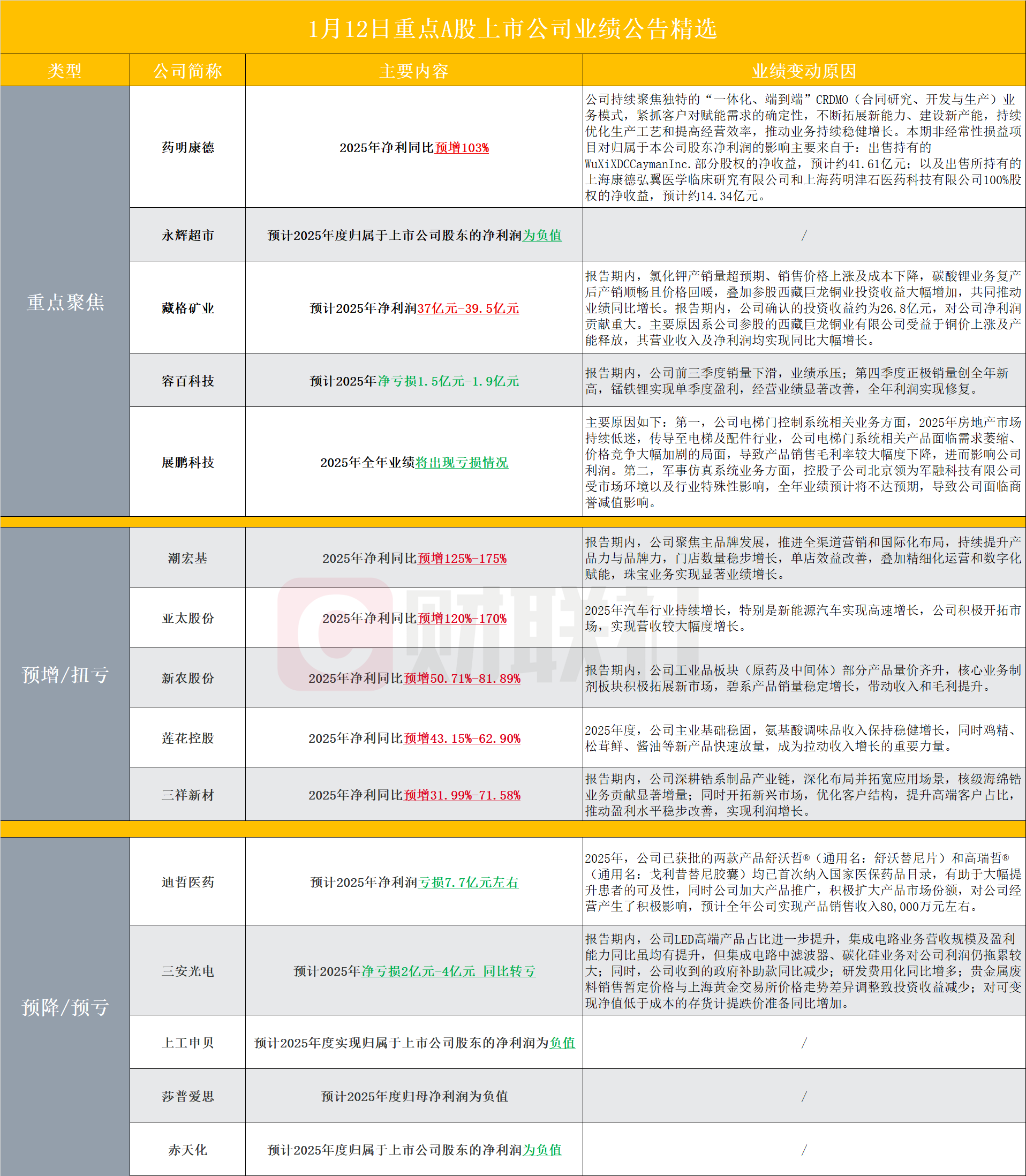 【盘后A股上市公司重点业绩公告精选】财联社1月12日电,据财联社不完全统计,截至发稿,盘后包括药明康德、永辉超市、藏格矿业、容百科技、展鹏科技、潮宏基、亚太股份、新农股份、莲花控股、三祥新材、迪哲医药、三安光电、上工申贝、莎普爱思和赤天化等多家A股上市公司发布2025年业绩预告。其中,药明康德2025年净利同比预增103%;永辉超市预计2025年度归属于上市公司股东的净利润为负值。