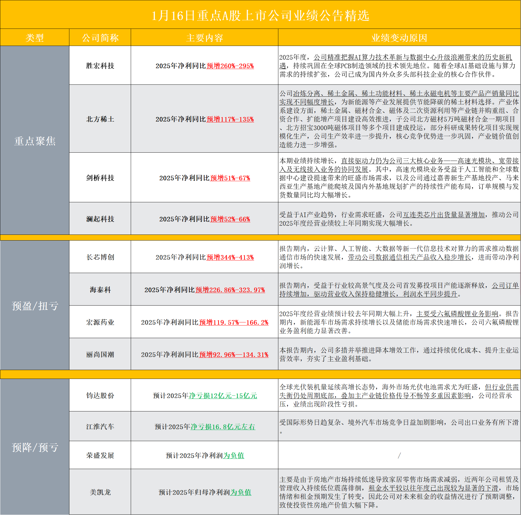 【盘后A股上市公司重点业绩公告精选】财联社1月16日电,据财联社不完全统计,截至发稿,盘后包括胜宏科技、北方稀土、剑桥科技、澜起科技、长芯博创、海泰科、宏源药业、丽尚国潮、钧达股份、江淮汽车、荣盛发展和美凯龙等多家A股上市公司发布2025年业绩预告。其中,胜宏科技2025年净利同比预增260%-295%;北方稀土2025年净利同比预增117%-135%。