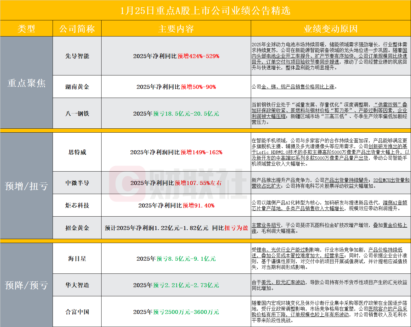 【周日A股上市公司重点业绩公告精选】财联社1月25日电,据财联社不完全统计,截至发稿,周日包括先导智能、湖南黄金、八一钢铁、思特威、中微半导、炬芯科技、招金黄金、海目星、华大智造、合富中国等多家A股上市公司发布2025年业绩预告。其中,先导智能预计2025年归母净利润同比增长424%-529%,订单规模同比快速回升;湖南黄金预计2025年归母净利润同比增长50%-90%。
