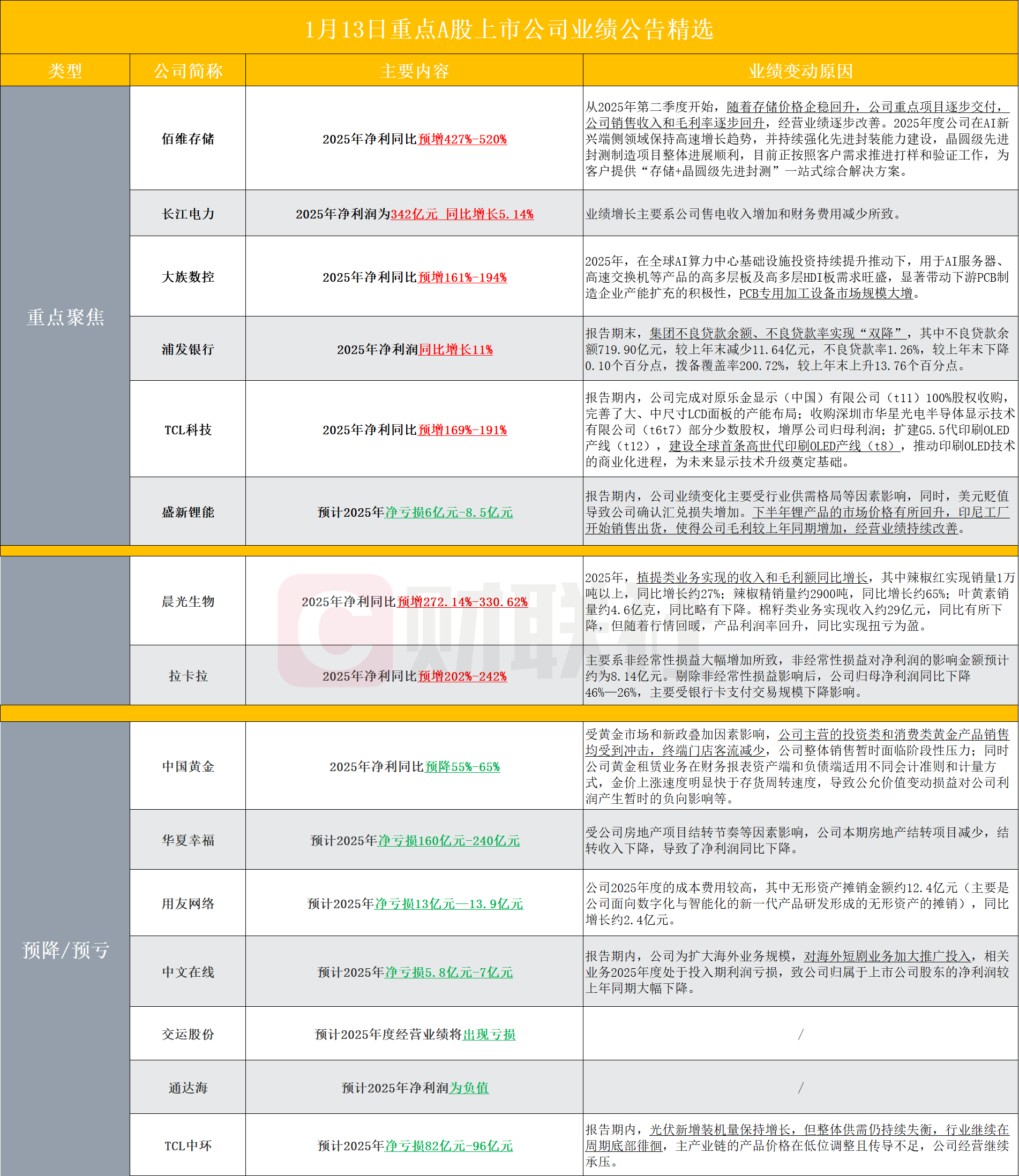【盘后A股上市公司重点业绩公告精选】财联社1月13日电,据财联社不完全统计,截至发稿,盘后包括佰维存储、长江电力、大族数控、浦发银行、TCL科技、盛新锂能、晨光生物、拉卡拉、中国黄金、华夏幸福、用友网络、中文在线、交运股份、通达海和TCL中环等多家A股上市公司发布2025年业绩预告或业绩快报。其中,佰维存储2025年净利同比预增427%-520%;长江电力2025年净利润为342亿元,同比增长5.14%。