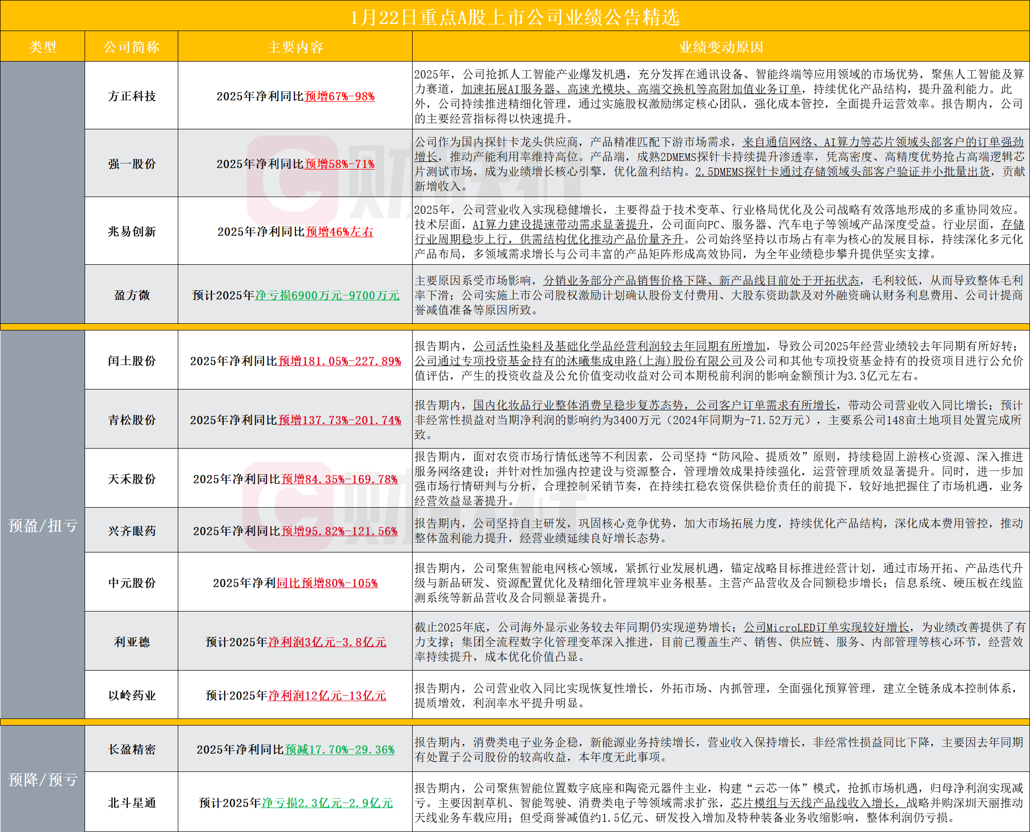 【盘后A股上市公司重点业绩公告精选】财联社1月22日电,据财联社不完全统计,截至发稿,盘后包括方正科技、强一股份、兆易创新、盈方微、闰土股份、青松股份、天禾股份、兴齐眼药、中元股份、利亚德、以岭药业、长盈精密、北斗星通等多家A股上市公司发布2025年业绩预告。其中,兆易创新公告,2025年净利同比预增46%左右,存储行业周期稳步上行,供需结构优化推动产品价量齐升。3连板盈方微公告,预计2025年净亏损6900万元-9700万元。