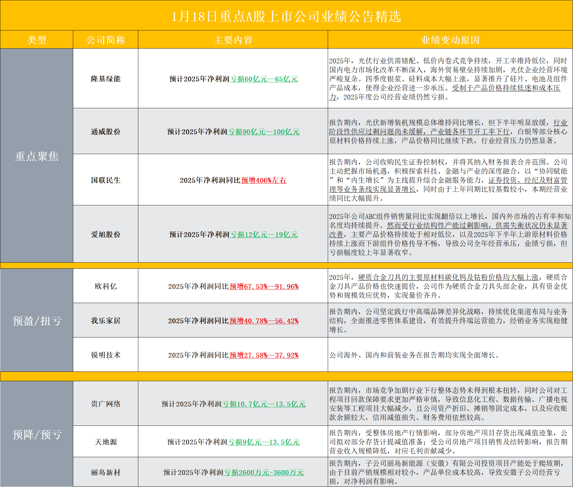 【周日A股上市公司重点业绩公告精选】财联社1月18日电,据财联社不完全统计,截至发稿,周日包括隆基绿能、通威股份、国联民生、爱旭股份、欧科亿、我乐家居、锐明技术、贵广网络、天地源、丽岛新材等多家A股上市公司发布2025年业绩预告。其中,隆基绿能预计2025年净利润亏损60亿元—65亿元;国联民生2025年净利润同比预增406%左右。