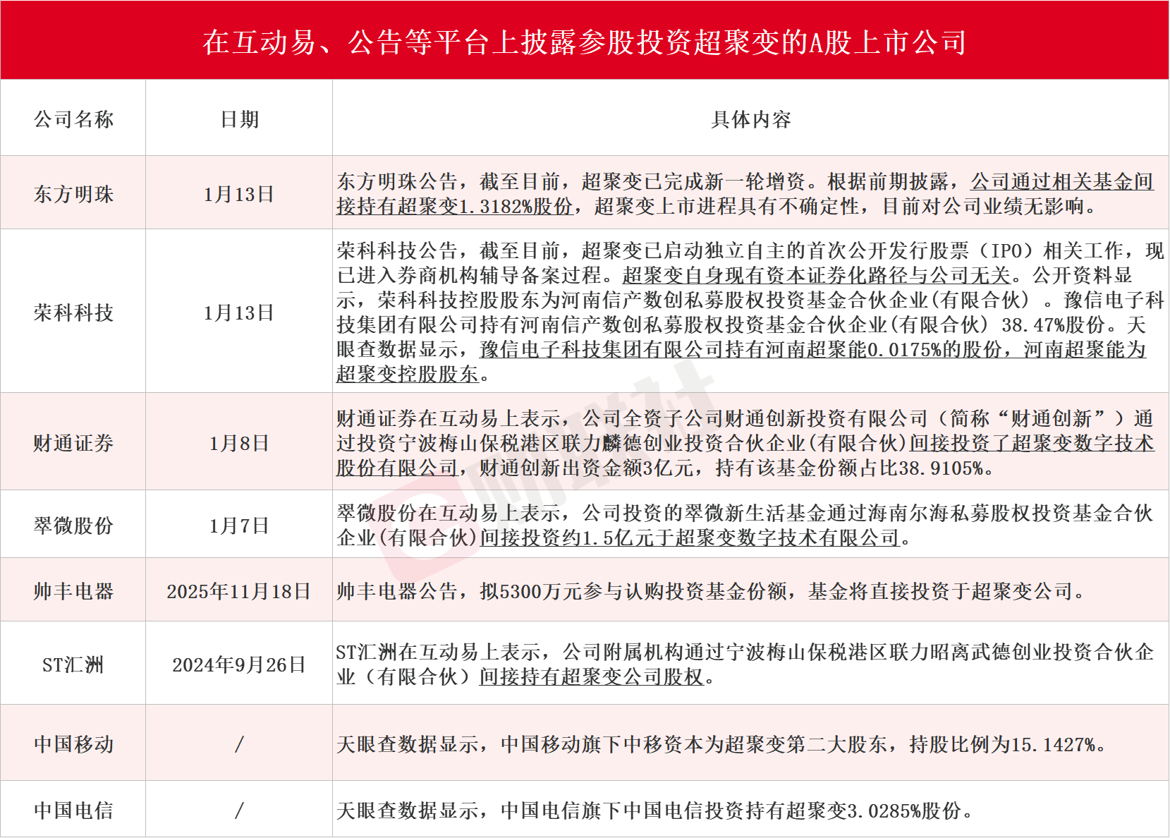 【超聚变启动上市辅导 东方明珠一度实现5连板 近10家上市公司在互动易等平台回应参股情况】财联社1月13日电,近日,超聚变数字技术股份有限公司启动上市辅导。A股方面,东方明珠一度实现5连板。据财联社不完全统计,东方明珠、荣科科技、财通证券、翠微股份、帅丰电器、ST汇洲、中国移动和中国电信在内的8家A股上市公司在互动易、公告等平台上披露参股投资超聚变。东方明珠今日公告,根据前期披露,公司通过相关基金间接持有超聚变1.3182%股份。