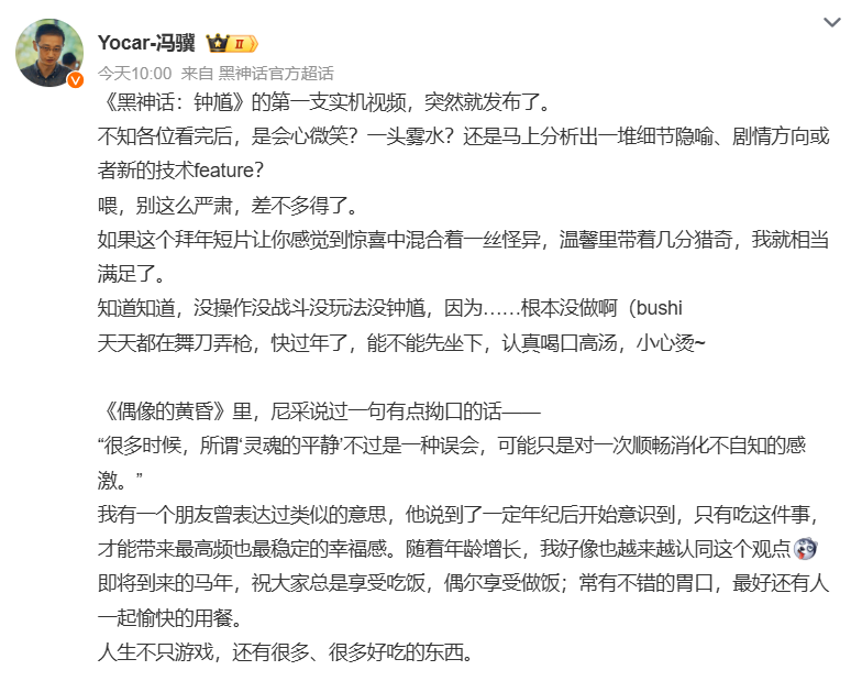 总体而言,这支实机视频并不包含游戏应有的操作、战斗以及玩法。游戏科学创始人、CEO冯骥表示:“如果这个拜年短片让你感觉到惊喜中混合着一丝怪异,温馨里带着几分猎奇,我就相当满足了。”游戏科学则表示:“本视频是为马年春节专门录制,与游戏实际剧情无关。”