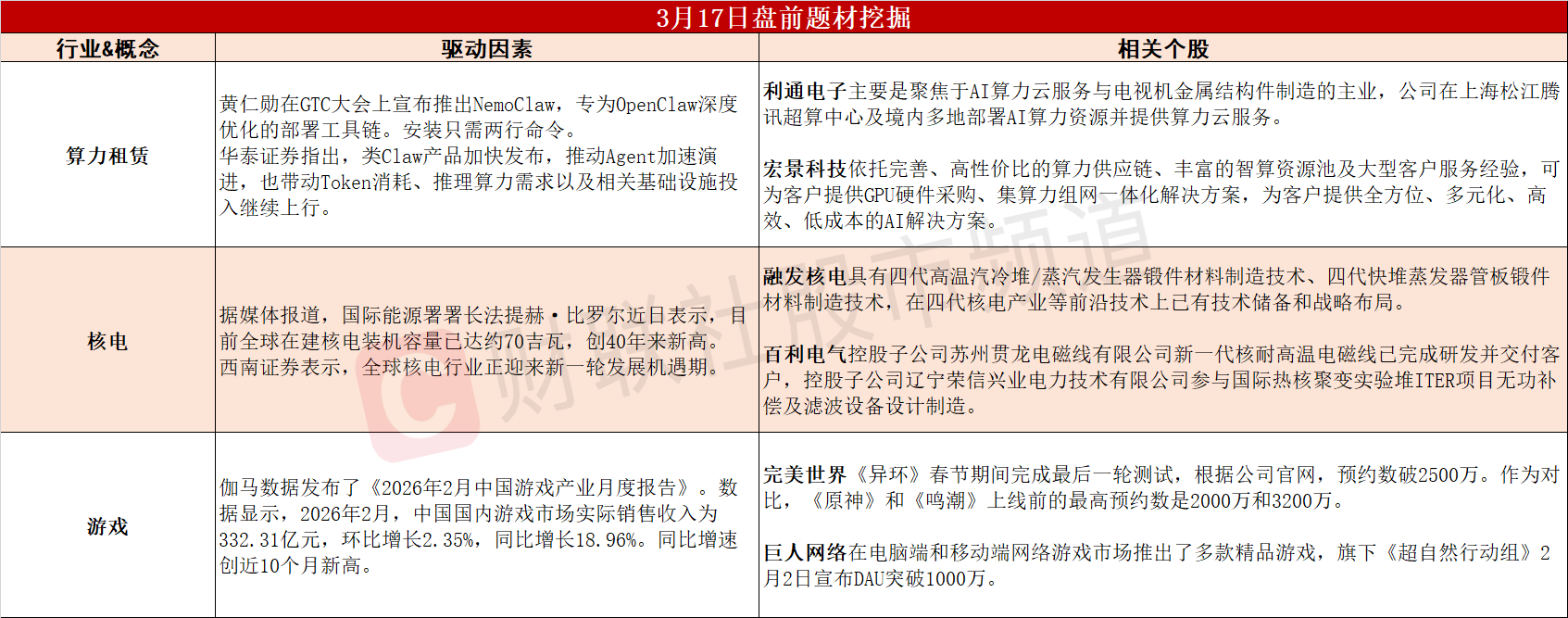 【盘前题材挖掘】①英伟达官方支持极简养虾,Token消耗激增或催生算力租赁热潮。②全球在建核电装机容量创40年新高,行业迎新一轮发展机遇期。③销售收入同比增速创近10个月新高,机构称游戏板块景气度将延续。