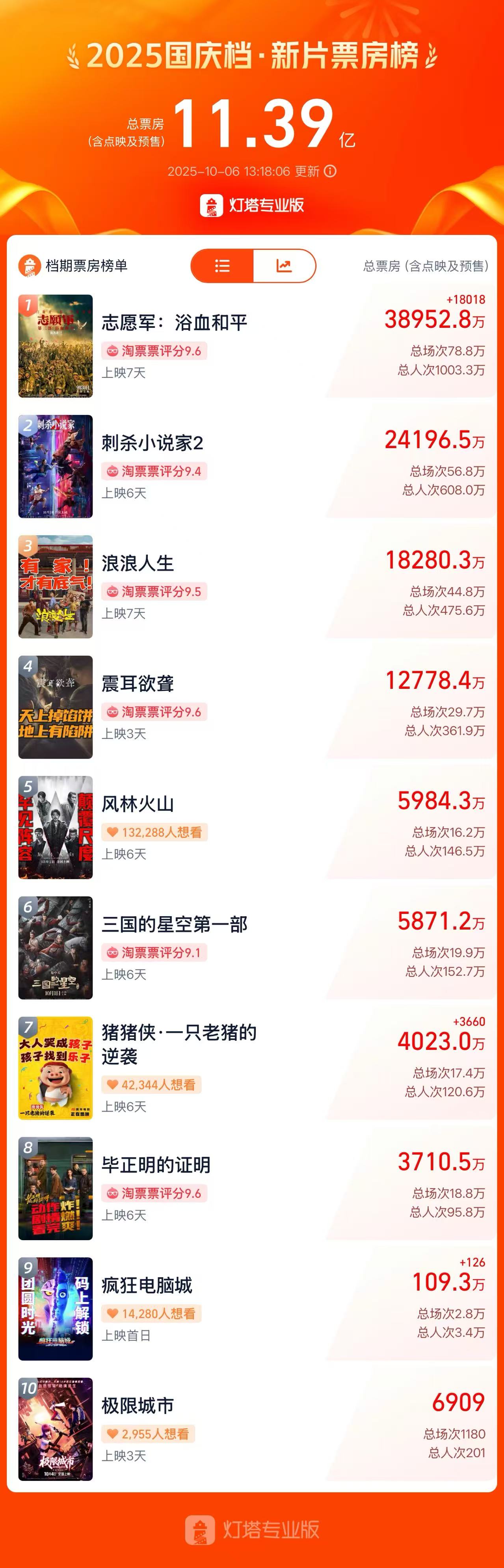 10月6日讯(编辑 笠晨)据网络平台数据,截至发稿,2025国庆档新片档期票房超过11亿,《志愿军:浴血和平》《刺杀小说家2》《浪浪人生》三部影片暂列国庆档票房榜前三位。