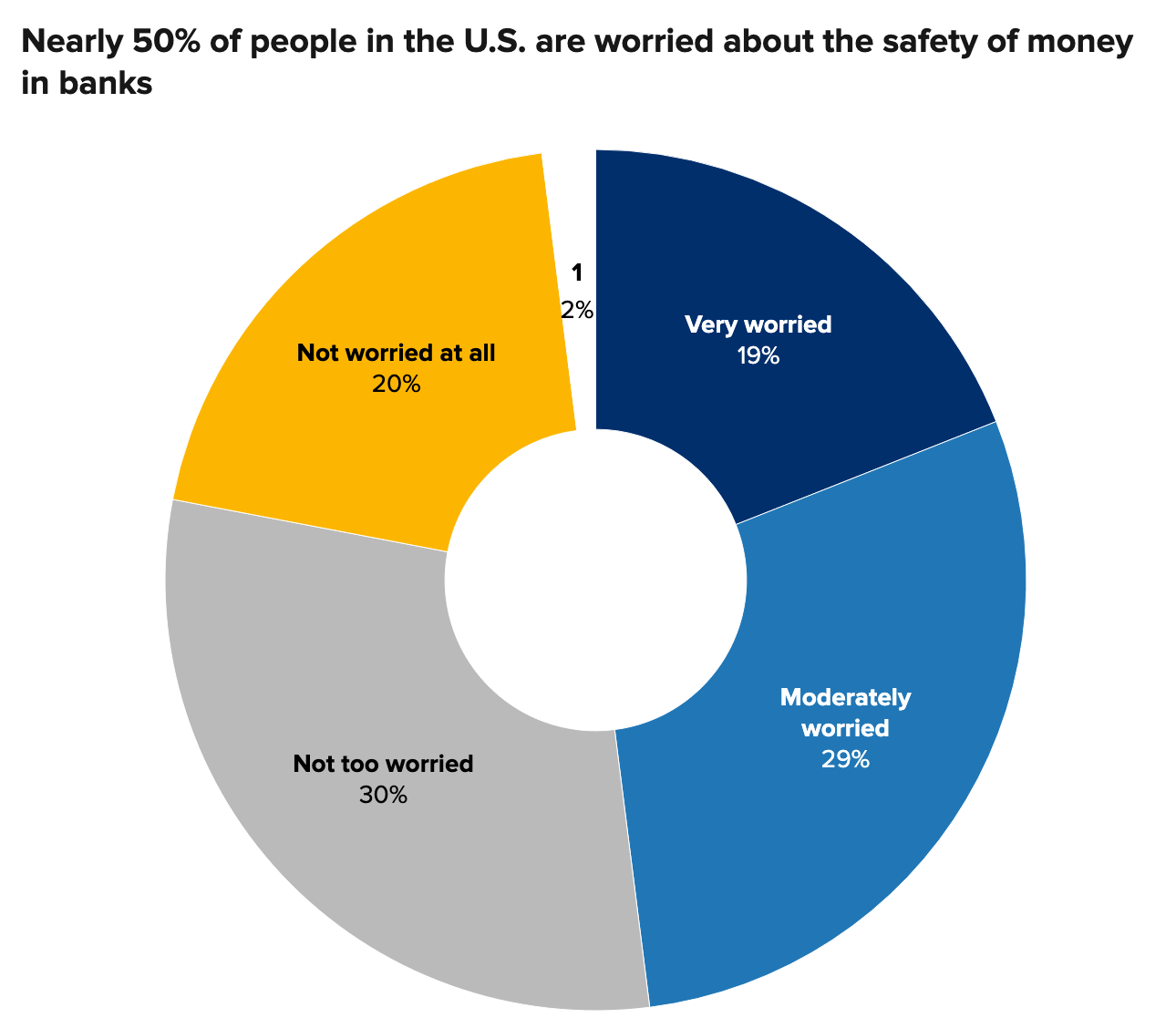 盖洛普称,在接受调查的1013名成年人中,近一半的人表示,他们对自己存在银行或其他金融机构的钱的安全性感到“非常担心”(19%)或“一般担心”(29%)。约20%的人表示他们一点也不担心。近三分之一的人表示“不太担心”。