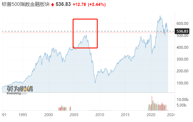 另有专家指出,在美联储不断加息的背景下,美国银行业不仅可能将面临“连环爆雷”,商业地产领域同样“危机重重”。行情显示,标普500指数金融板块指数即将跌回2007年的峰值下方。
