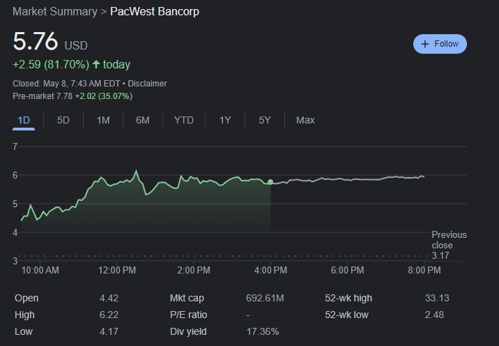 5月8日讯(编辑 赵昊)周一(5月8日)美股盘前,西太平洋合众银行(PacWest)延续上周五的反弹势头,股价涨超30%,引领美国地区性银行集体走高。