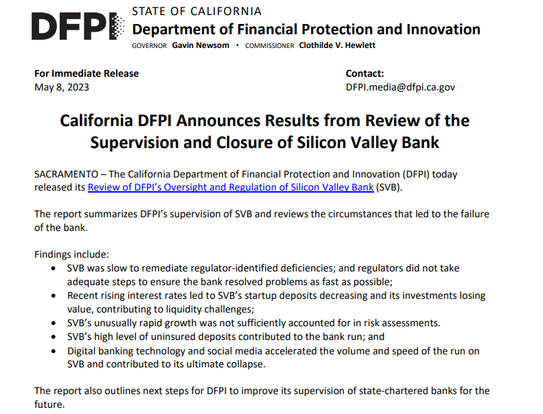 根据DFPI周一发布的报告,在对硅谷银行的监管工作中,DFPI发挥着辅助作用,而旧金山联邦储备银行承担主要监督责任,后者未来可能会投入更多人员进行监督。