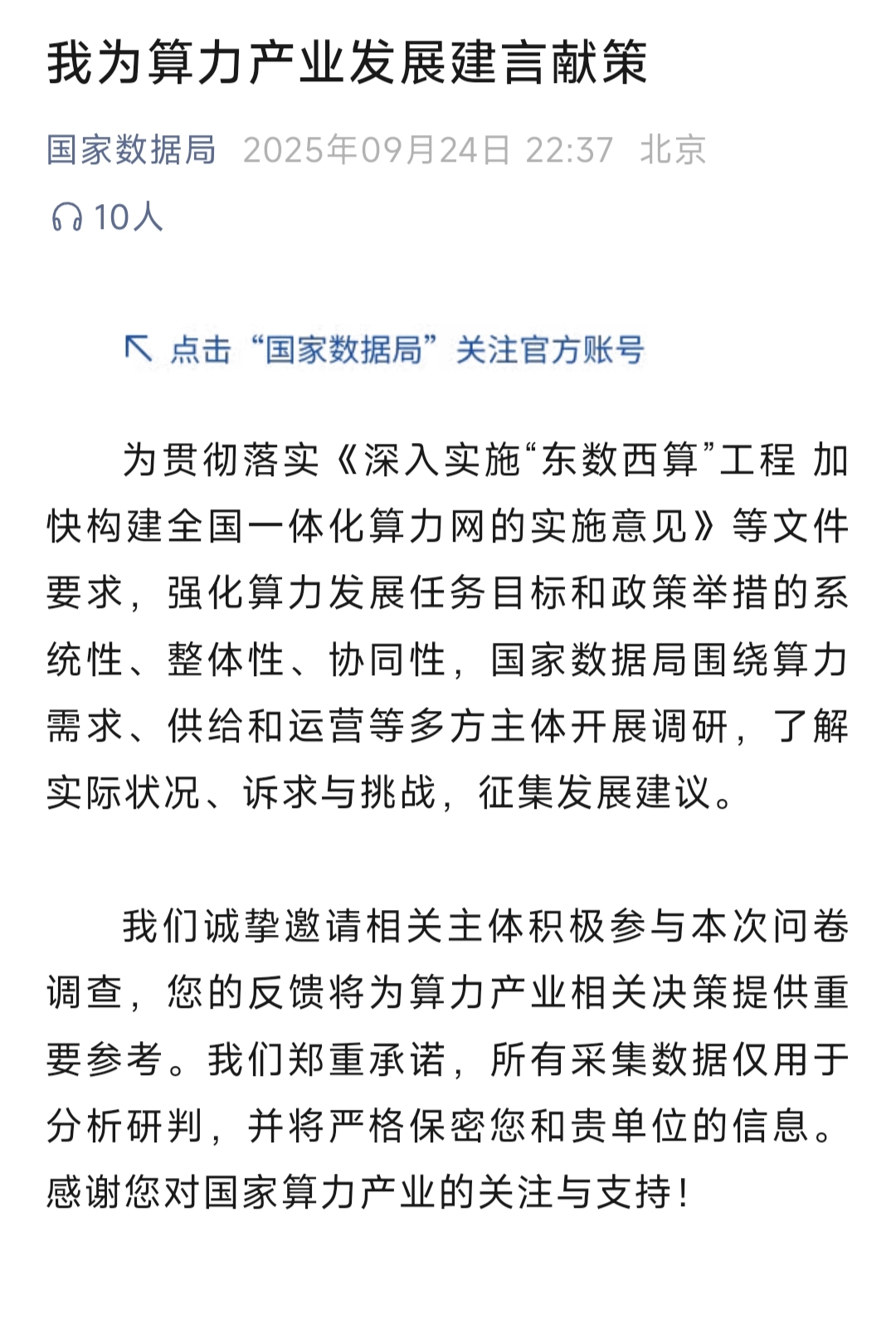 值得一提的是,国家数据局近期也公开围绕算力需求、供给和运营等多方主体开展调研,了解实际状况、诉求与挑战,征集发展建议。