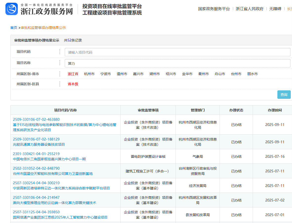 记者梳理各地投资项目在线审批监管平台观察,仅三季度,就有多个算力中心项目办理结果公示。比如,中国电信长三角国家枢纽嘉兴算力中心项目一期;安徽省安庆经开区行政审批局批复的安庆经开区协同制造5G应用创新与算力中心建设项目。