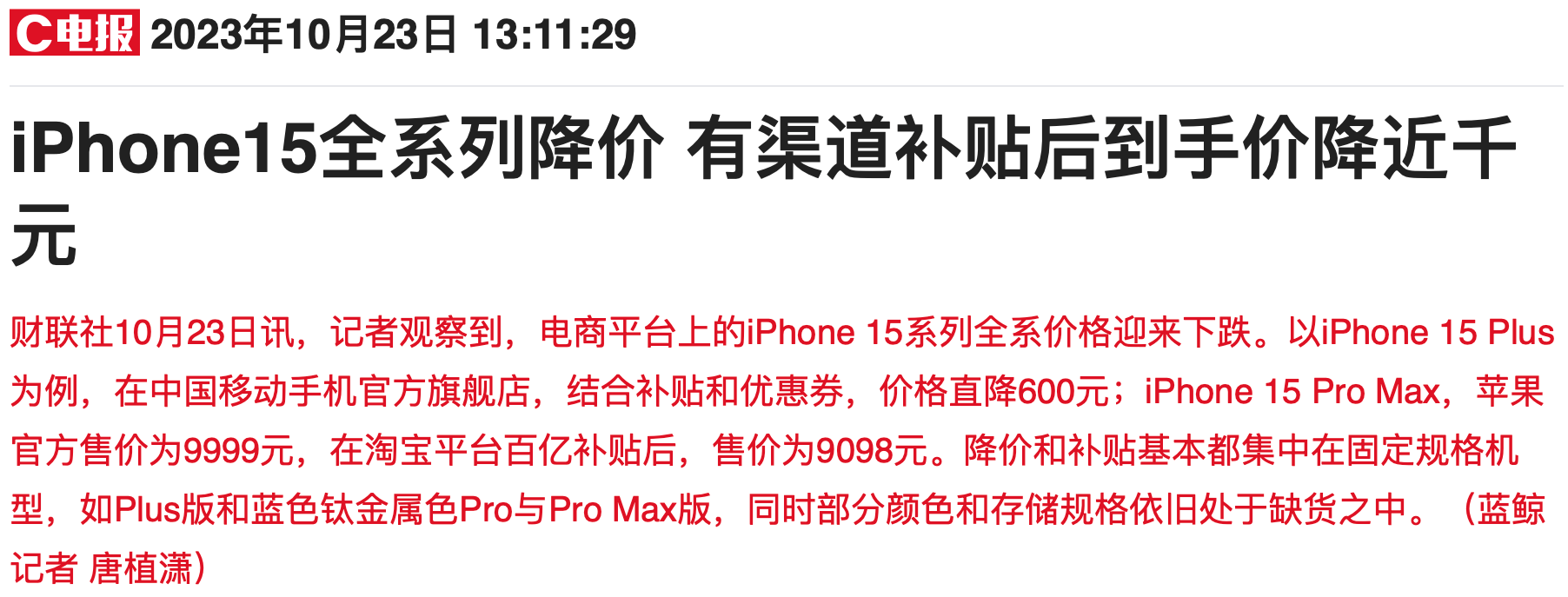 工业富联是富士康旗下A股主板上市公司。天眼查数据显示,富士康集团在内地关联富士康工业互联网股份有限公司、富士康科技集团有限公司、富泰华工业(深圳)有限公司等多家公司。据悉,富士康作为全球最大的电子科技制造服务商,营收来自于苹果iPhone的代工业务占到45%,而苹果iPhone 15系列代工厂中,富士康占了58%。而苹果刚刚发布一个月左右的iPhone 15系列机型,近日价格大幅崩塌,跌幅接近千元。