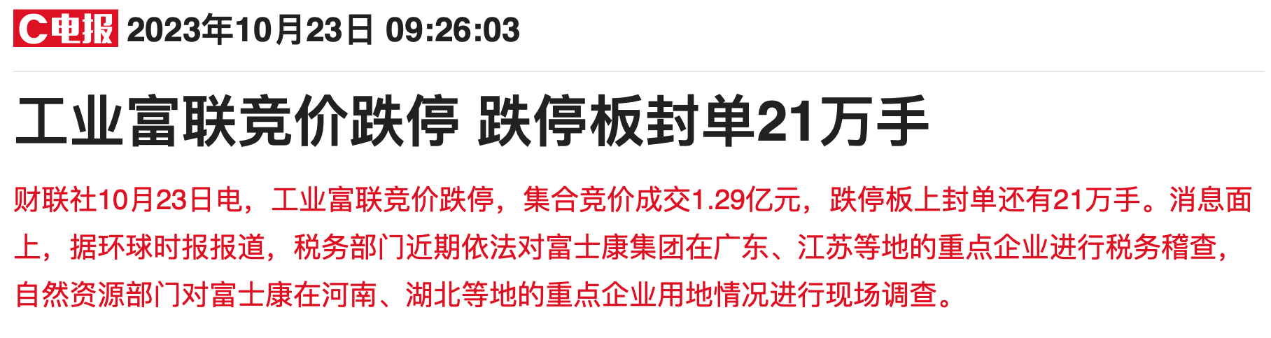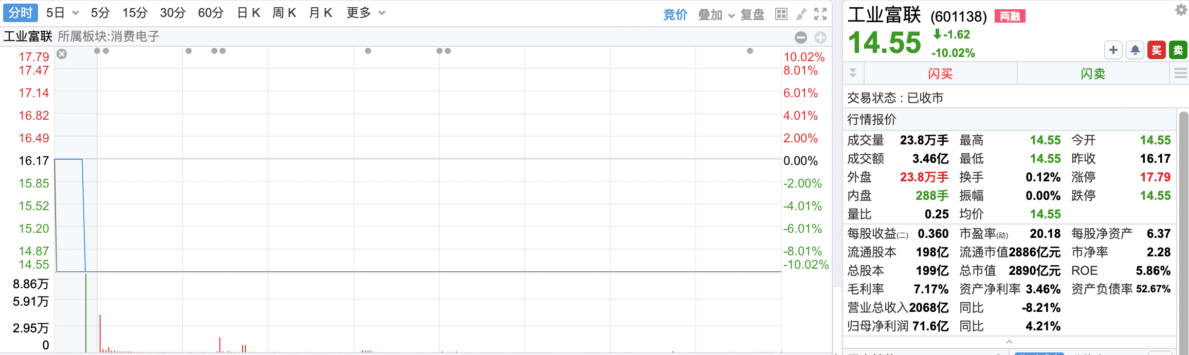 10月23日讯(编辑 宣林 特约编辑 张书维)总市值近2900亿元的消费电子巨头工业富联开盘一字跌停,总市值蒸发321亿元,截至收盘跌停板封单超过68万手。