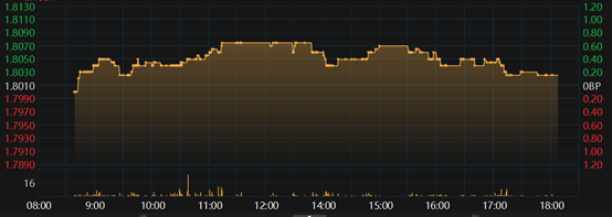 今日受权益市场反弹、风险偏好的压制的影响,债市收益率整体上行。不过,在10月社融信贷数据发布后,10年国债活跃券250016的收益率上行幅度有所收窄,午后最高点位于1.8070%,截至18:00回落至1.8025%。