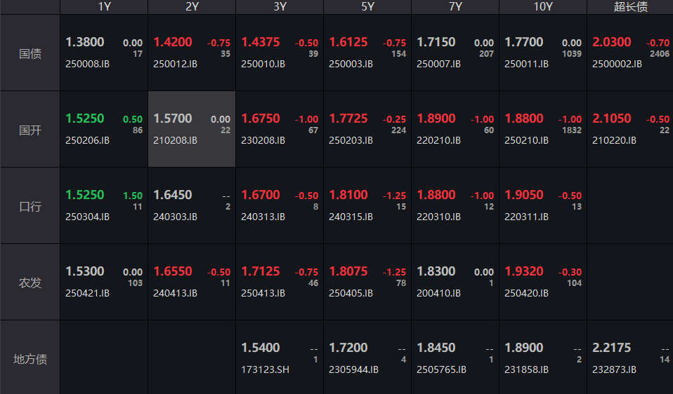 银行间主要利率债收益率多数下行,截至下午16:30分,10年期国债活跃券250011收益率持平上一日报1.77%,10年期国开债活跃券250210收益率下行1bp至1.88%,30年期国债活跃券2500002收益率下行0.7BP至2.03%。