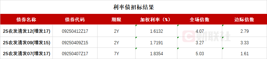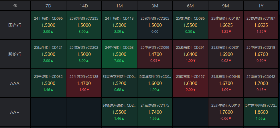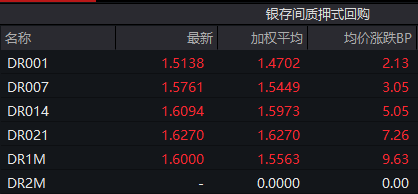 银银间回购定盘利率全线上涨。FDR001涨5.0个基点报1.49%;FDR007涨4.0个基点报1.55%;FDR014涨10.0个基点报1.6%。