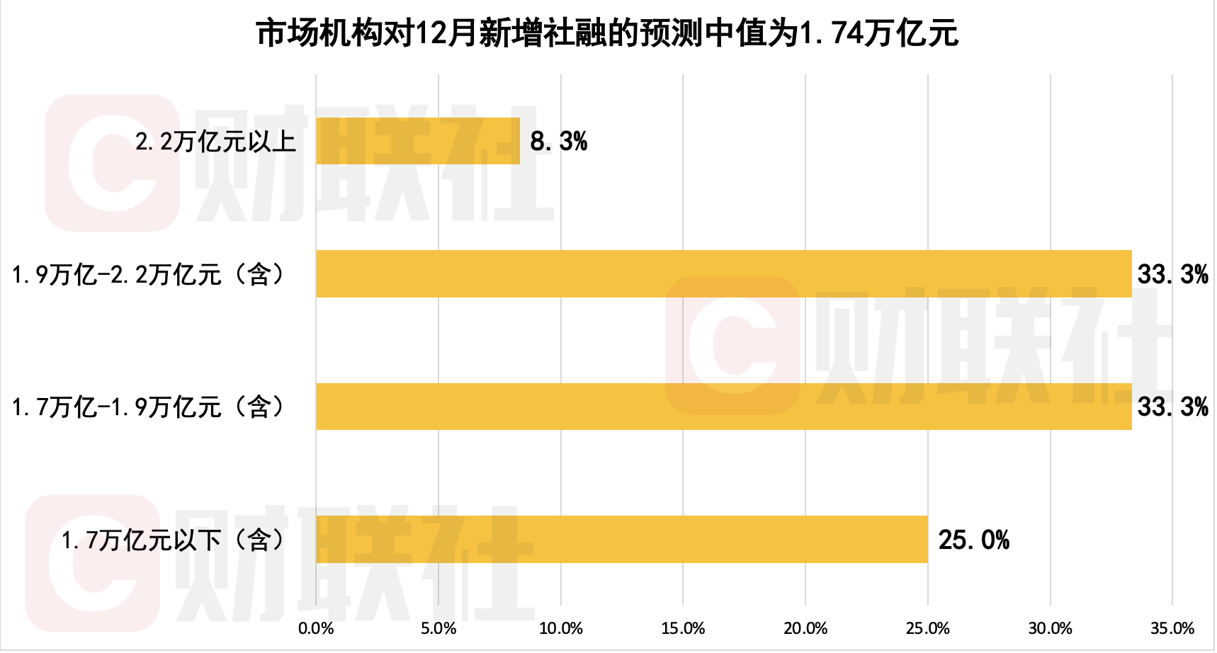 本期调查显示,市场机构对12月新增社融规模预测中值为1.74万亿元,较2024年同期2.86万亿元少增1.12万亿元,参与机构预测区间为1.4万亿至2.3万亿元。由于社融同比少增,超六成市场机构预计12月末社融增速为8.2%,环比下降0.3个百分点。