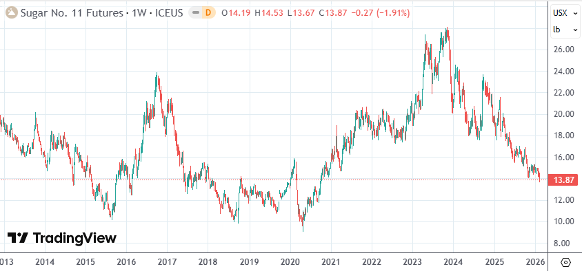 本周,美国11号糖期货累跌2.13%,周四时跌破14美分关口,,最低报每磅13.67美分,创下2020年10月以来最低价位,已不到2023年高点的一半。