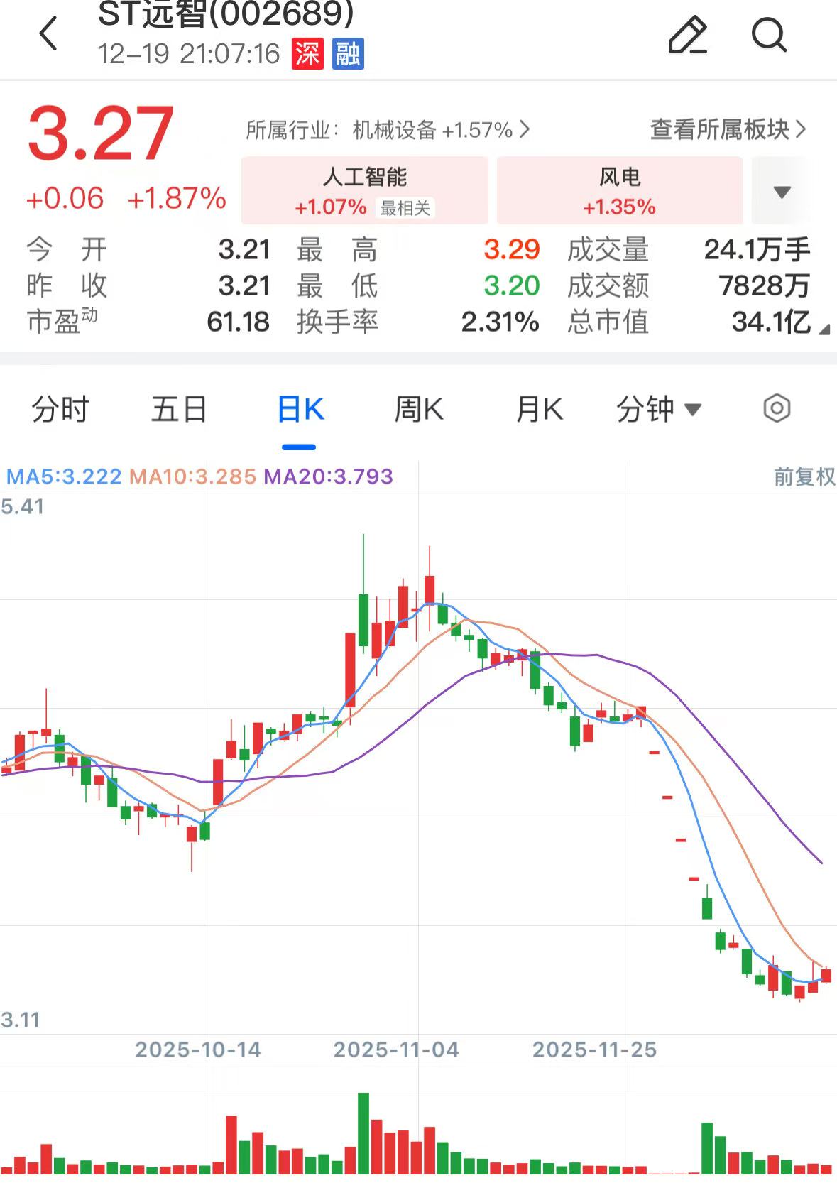 截至今日收盘,ST远智股价上涨1.87%,报收3.27元/股,总市值为34.12亿元。