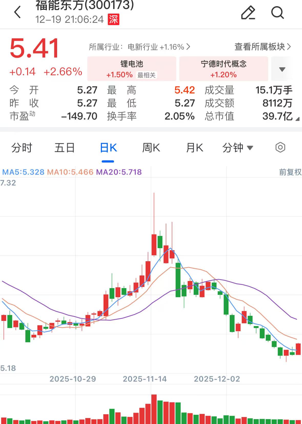 截至今日收盘,福能东方股价上涨2.66%,报收5.41元/股,总市值为39.75亿元。