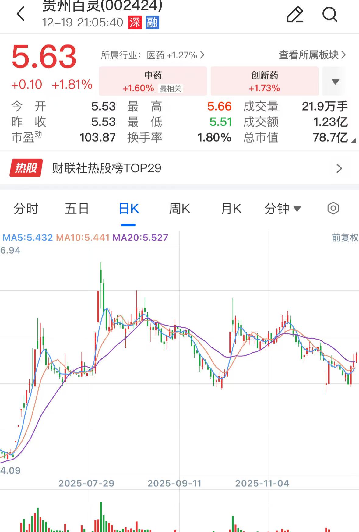 截至今日收盘,贵州百灵股价上涨1.81%,报收5.63元/股,总市值为78.68亿元。