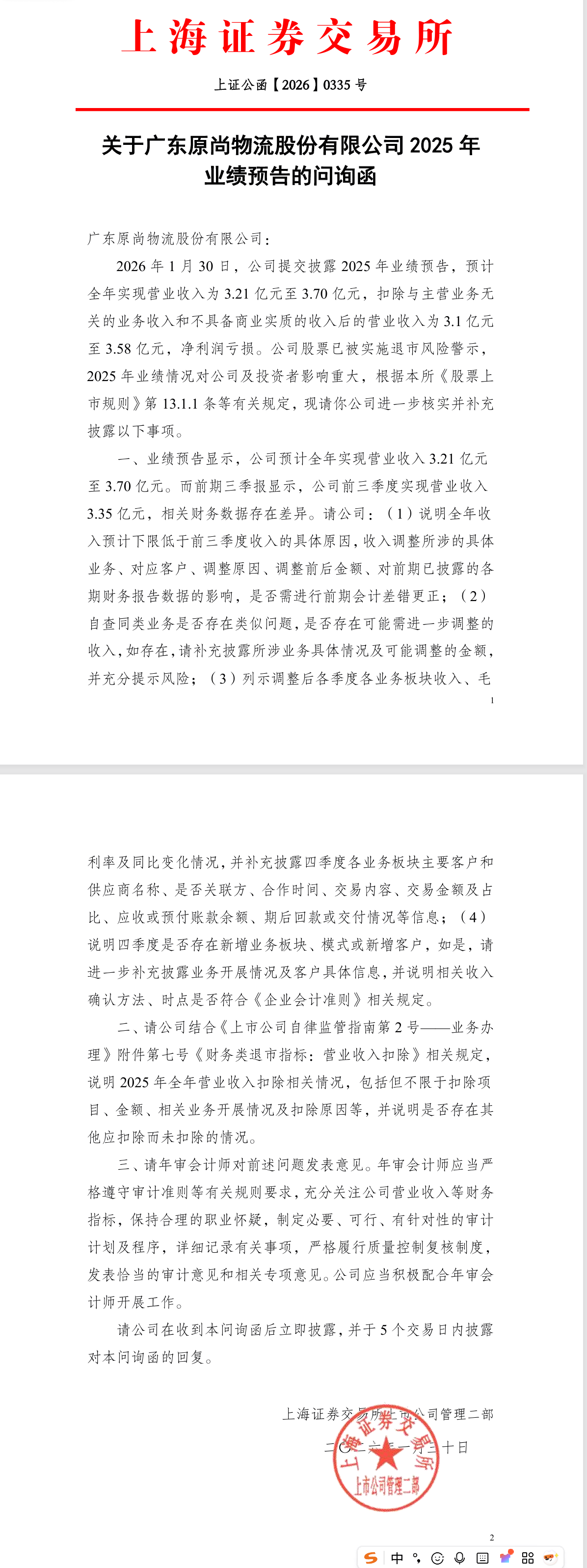 财联社1月30日电,上交所就广东原尚物流股份有限公司2025年业绩预告下发问询函。